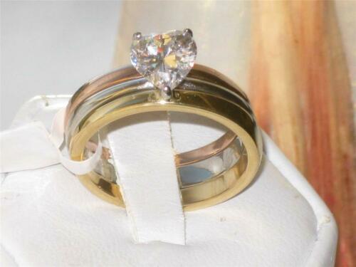 A 2.2k AAA grade cubic zirconia heart cut 7mm is set in a rose gold and yellow gold band that is heavily electroplated on steel.